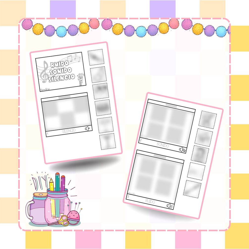 • Páginas imprimibles con los tres conceptos: Ruido – Sonido – Silencio, diseñadas en formato de flipbook.