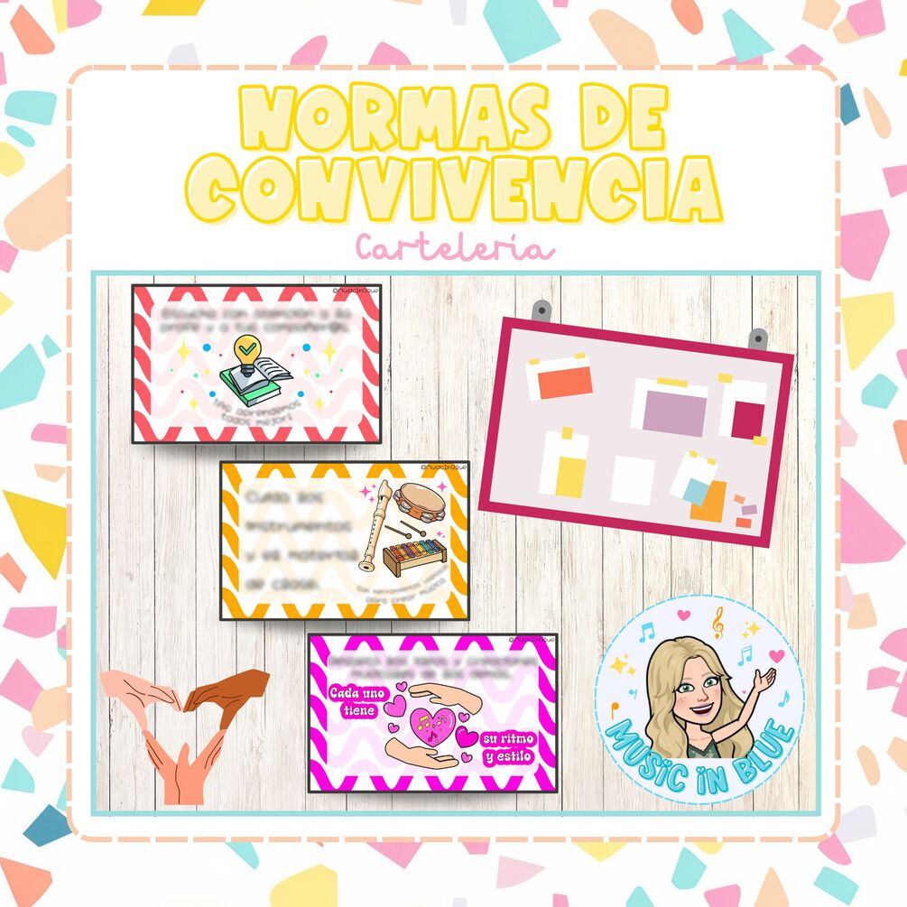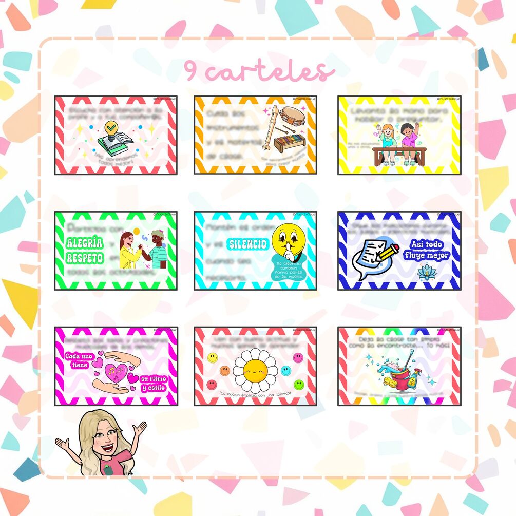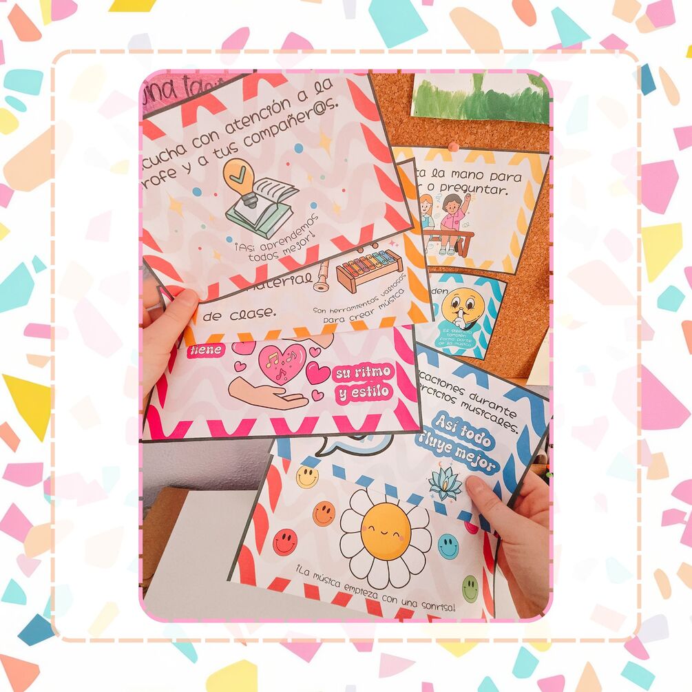 9 carteles de normas de convivencia, diseñados con los colores de la escala musical, ideales para ambientar el aula y reforzar el buen clima escolar de forma visual y armoniosa.